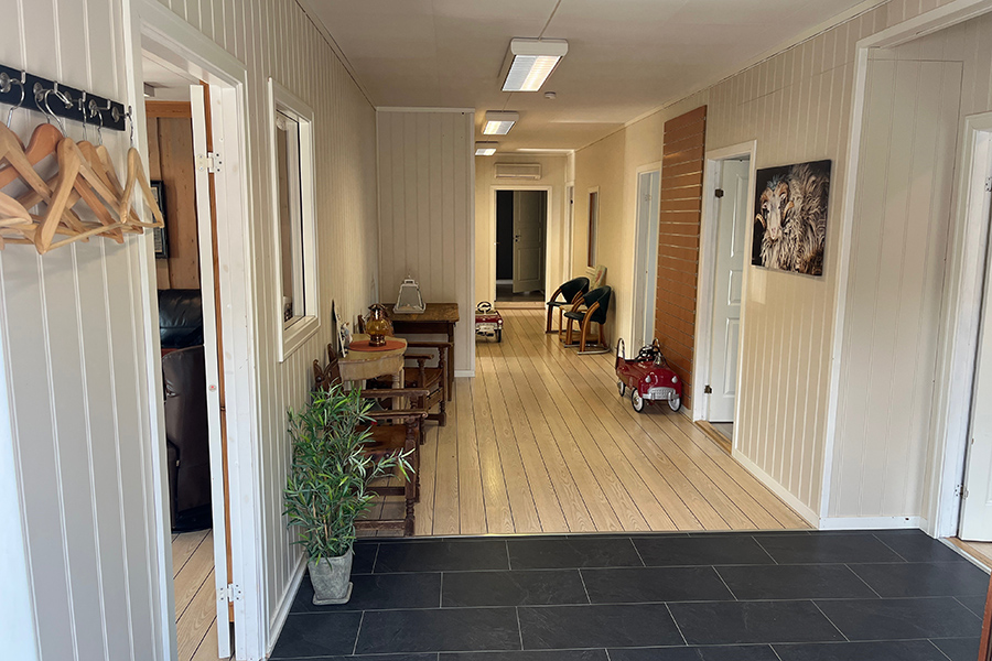 Schlafen: 1 Schlafzimmer im Obergeschoß mit 2 Einzelbetten sowie 1 Schlafzimmer mit einem Etagenbett, welches vom Wohnbereich separiert werden kann. Wohnen: Gemütlicher Wohnbereich mit Couch, Esstisch, SAT-TV, WLAN und offener Küche. Im Wohnbereich befindet sich ein Schlafbereich, der mit einer Falttür geschlossen werden kann. So entsteht ein zweites Schlafzimmer. Kochen: Voll ausgestattete Küche mit Elektroherd, Backofen, Mikrowelle, Geschirrspüler, Kühlschrank, Kaffeemaschine. Bad: Bad mit Dusche und WC Sonstiges: Große Terrasse und Grillplatz zur gemeinschaftlichen Nutzung, Waschmaschine. Entfernungen dieser Unterkunft