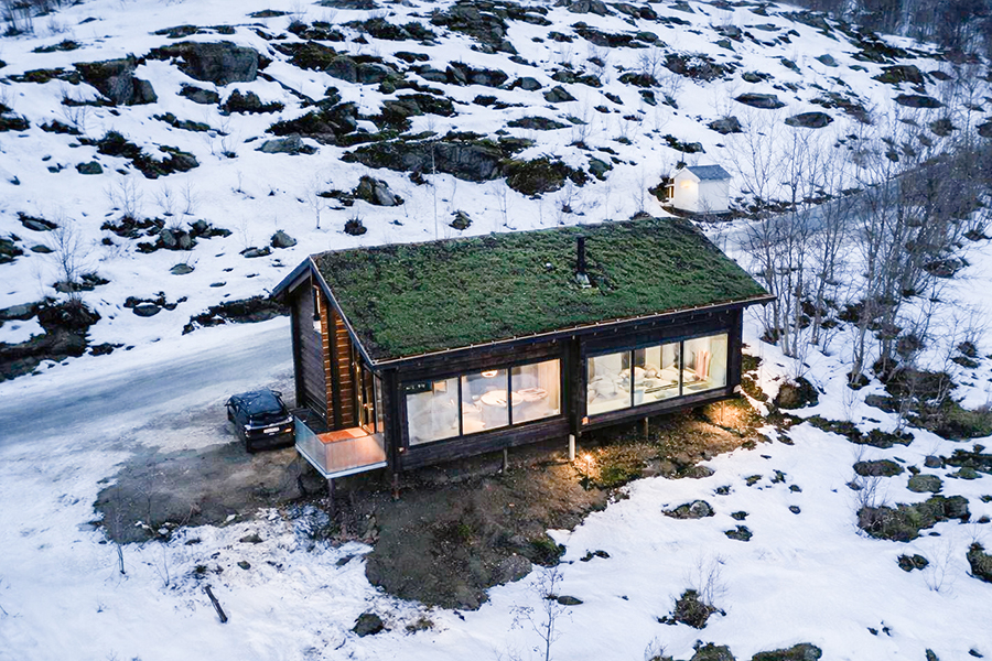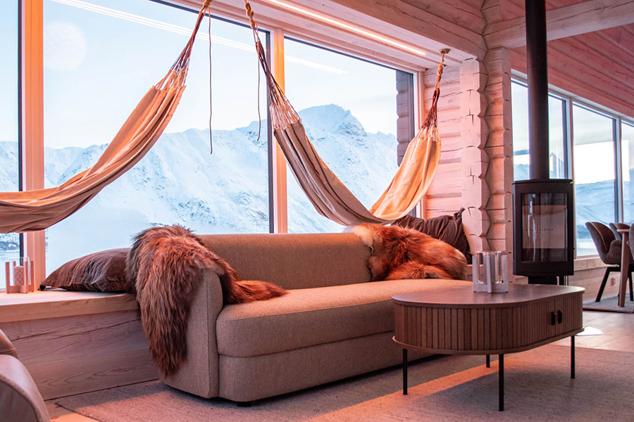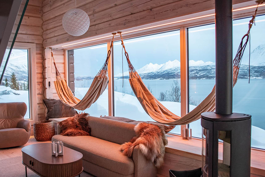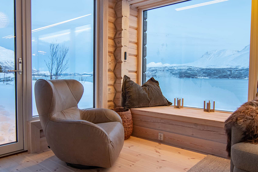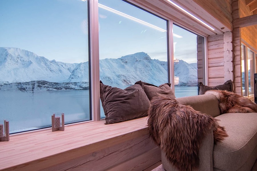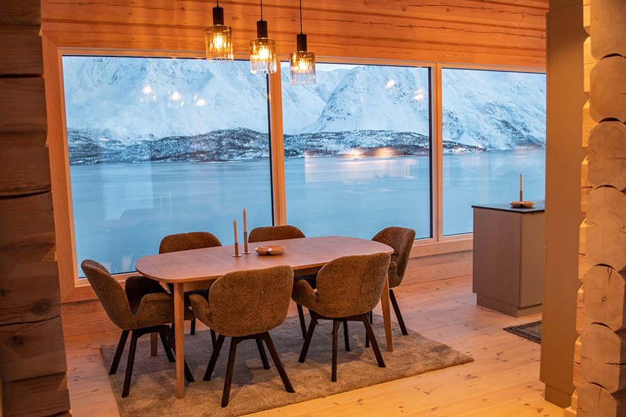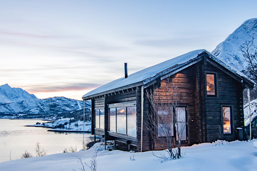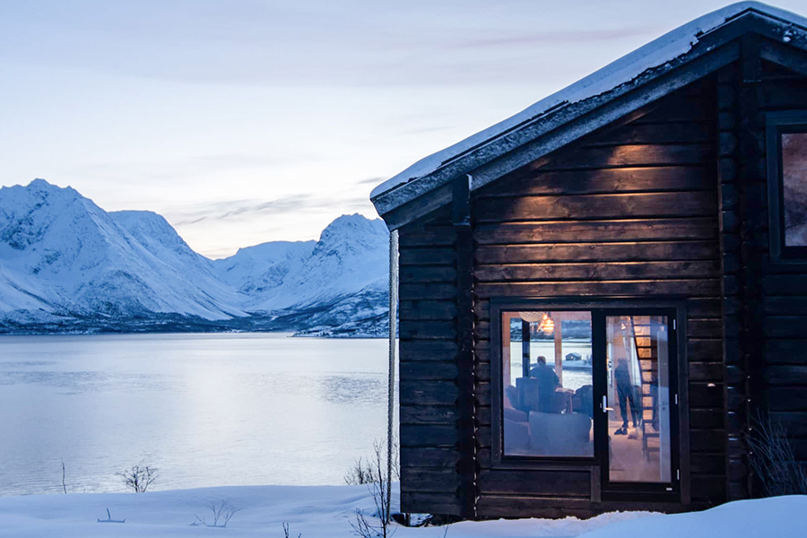 Mit Blick auf die Lyngen-Alpen: die Ferienhäuser des Lyngen Sjøcamps.