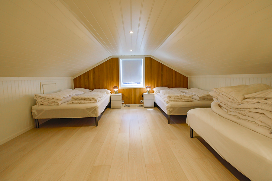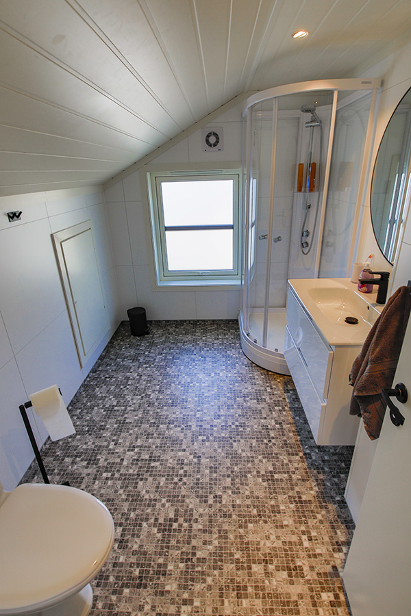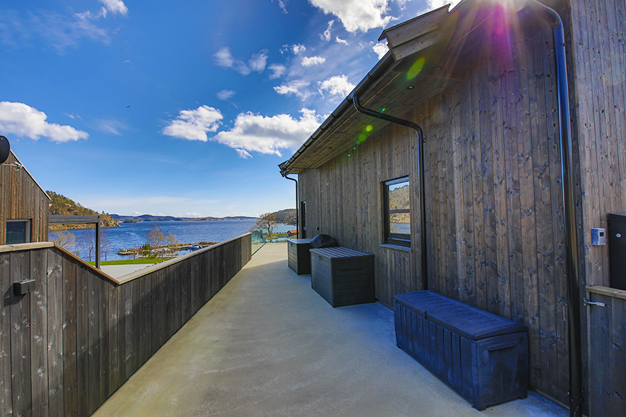 Schlafen: 1 Schlafzimmer mit einem Bett 180 x 200 cm (Erdgeschoss), 1 Schlafzimmer mit einem Bett 150 x 200 cm (Erdgeschoss), 1 Schlafzimmer mit einem Bett 120 x 200 cm (Obergeschoss), 1 Schlafzimmer mit einem Bett 150 x 200 cm (Obergeschoss). Wohnen: Geräumiger Wohnbereich im Erdgeschoss. Die große Glasfront ermöglicht einen direkten Blick auf den Fjord. Zugang zur Terrasse zur Fjordseite. Gemütliche Sitzecke mit Sat-TV, DVD-Player und Stereoanlage/Sound-System vorhanden. Kochen: Vollausgestattete offene und moderne Studioküche mit 4-Plattenherd/Backofen, Geschirrspüler, Kühlschrank, Kaffeemaschine, Mikrowelle, Gefrierschrank Bad: 1 Bad im Erdgeschoss mit Badewanne, Dusche, WC und Doppelwaschbecken sowie 1 Bad im Obergeschoss mit Dusche, WC und Waschbecken. Sonstiges: Große Terrasse mit direktem Blick auf den Fjord. Gartenmöbel, Grill. Separater Waschraum mit Waschmaschine, Trockner vorhanden. Abstellkammer mit Gefrierschrank. Hier können auch Angelgerät und Angelkleidung verstaut werden. Elektrischer Schuhtrockner im Eingangsbereich. Eigener Bootsanlegeplatz am Gemeinschaftssteg. Entfernungen dieser Unterkunft