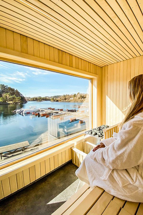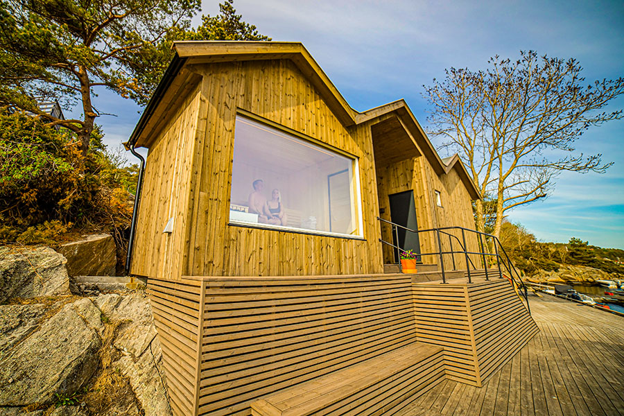 Die Ferienhäuser liegen in ruhiger Lage, nur wenige Schritte von Rezeption und Booten entfernt, an einem flachen, bewaldeten Hang, der Ihnen einen sehr schönen Blick über die Tregde-Bucht und das Meer ermöglicht. Die Ferienwohnungen haben direkte Wasserlage.